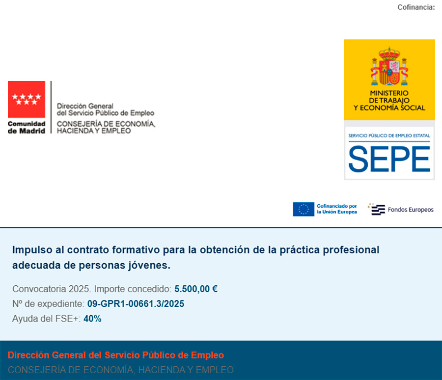 Esta subvención, con un importe concedido de 5.500,00 € y cofinanciada en un 40% por el FSE+, nos permite seguir apostando por la integración laboral de los jóvenes y por la mejora de la formación práctica en nuestro sector.